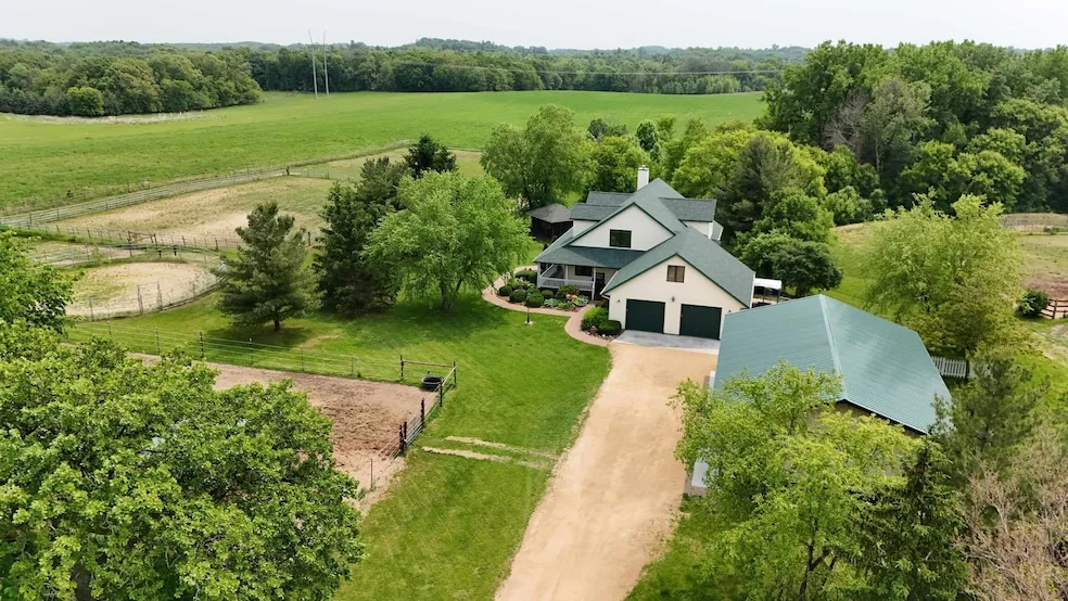Welcome to W8135 830th Street in River Falls, WI, a stunning 16.5-acre horse-ready ranch that blends luxury living with rural charm and practicality. Perfectly set up for equestrian use, this property features two fenced pastures with shelters, all surrounded by the peace and beauty of nature. Abundant wildlife and a quiet, friendly neighborhood make this a serene retreat you ll never want to leave. The home has been extensively upgraded for comfort and efficiency, including a new roof, 5" gutters and downspouts, new windows, and a new mound septic system. Enjoy your morning coffee or evening sunsets from the wraparound porch, or host unforgettable gatherings on the brand-new 30-foot brick patio with a built-in fire pit. For even more outdoor entertaining, the screened gazebo is a dream, complete with lighting and a ceiling fan. Inside, the open-concept kitchen is a chef s delight, featuring quartz countertops, under-cabinet lighting, a prep sink, built-in Vino Vault, and high-end Bosch and KitchenAid appliances. A second built-in convection oven and microwave make hosting a breeze. The great room features rich wood floors, a wood-burning fireplace, and designer lighting from Craftmade, Meyda Tiffany, and Troy. The finished basement adds tremendous value, with tongue-and-groove pine finishes, a newly tiled entry, an updated bathroom, an exercise room, and a full wet bar with granite countertops and custom cabinetry. The attached insulated garage includes an upstairs attic and new LED lighting, while the massive 32' x 48' HIXwood workshop provides six-car storage, a concrete floor, and a new poured apron for easy access. Additional upgrades include new storm doors, a high-efficiency water heater, two new garage doors, and a fenced yard with a built-in kennel for your furry friends. Every detail has been carefully curated to offer comfort, style, and functionality in a peaceful country setting just minutes from town. For the work from home crowd, enjoy working with fiber high-speed internet! Serenity and Amenity! This is the one you've been waiting for! Due to the transportation of horses, seller prefers to move out in the spring, necessitating either a close/rent back or a delayed closing until spring.
