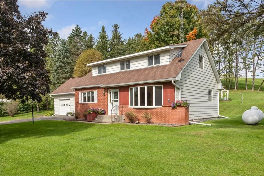 Welcome to this delightful 4-bedroom, 2-bath farmhouse nestled on 1.67 lush, green acres just outside of Ellsworth, WI. Offering the perfect blend of country charm and character, this well-maintained home is a rare opportunity for those seeking space, privacy, and lifestyle versatility, all within easy reach of town conveniences. Step inside to a spacious living room featuring bay windows that flood the space with natural light, ideal for entertaining or relaxing with family. The open-concept kitchen and dining area provides a functional layout for daily living and gatherings, complete with ample cabinetry and counter space, appliances, and a kitchen window to enjoy the beauty of nature. A main-floor bedroom and full bath add convenience and versatility, perfect for yourself, guests, or home office. Upstairs, you'll find three additional bedrooms, two of which include a built-in dresser and desk combo, maximizing space and storage. A half bath completes the space. The partially finished lower level features a dedicated laundry area and offers potential for a rec room, hobby space, or additional storage. Enjoy peaceful mornings and serene evenings on the back deck, overlooking a tree-lined backyard that delivers privacy and natural beauty. The attached 2.5-car garage features built-in storage, ideal for organized living, while two versatile outbuildings provide space for hobbies, storage, or all your landscaping needs. Whether you're entertaining, gardening, or simply relaxing under the stars, this property offers endless lifestyle benefits. The large acreage invites outdoor living, while mature trees and open space create a peaceful country setting you will surely appreciate. The home inspection has been completed for you. See supplements for photos, tour, Matterport Floorplan, and more. Don't miss this unique opportunity to own a picturesque farmhouse retreat in the heart of Pierce County. Schedule your showing today and experience the beauty of country living!