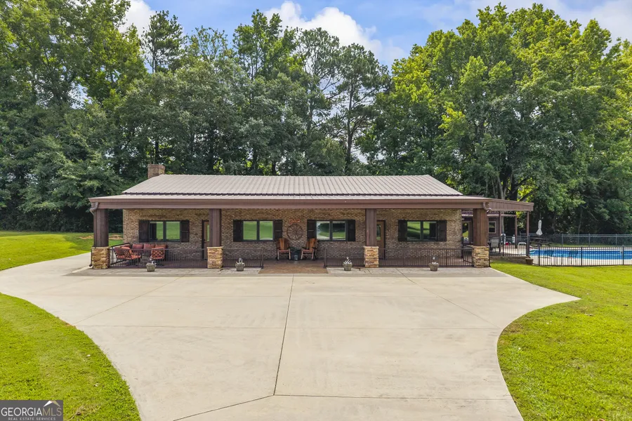 Stunning 2-bedroom, 1.5-bath custom barndominium situated on 5 acres in the quiet countryside of Pike County. his well-appointed home offers 1,150 sq. ft. of thoughtfully designed living room space, featuring high ceilings and engineered hardwood flooring throughout. The spacious great room includes a large gas fireplace and four custom built-ins, flowing seamlessly into a massive eat-in kitchen equipped with custom cabinetry, soft-close drawers and doors, chiseled-edge granite countertops, stainless steel appliances, a farm sink, and a large dining area with a built-in hutch. Triple-pane Pella windows with built-in blinds fill the home with natural light while enhancing energy efficiency. Enjoy year-round comfort with dual 13 SEER Ruud heat pumps. The bathroom includes a luxurious large tile walk-in shower and a jetted tub for spa-like relaxation. Built with low-maintenance brick and topped with a durable metal roof, the home also features over 1,500 sq. ft. of covered porches that overlook 15+ acres of open land. The property boasts approximately 800 feet of road frontage and includes a 24' x 40' saltwater pool and a 576 sq. ft. pool house/in-law suite for guests or extended family. A spacious garage and a separate barn provide ample storage for equipment or recreational use.