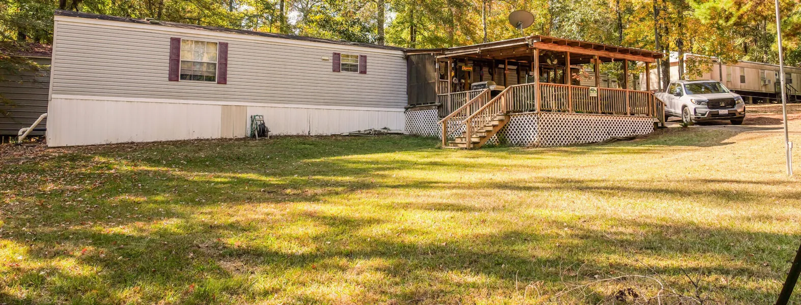 The mobile home features covered front decks equipped with a refrigerator, stove, sink, grill, and burn pit, perfect for outdoor cooking and creating special memories with family and friends. The front deck also includes a wheelchair-accessible ramp. The back deck leads down to a covered metal shop with power, ideal for storing your river gear and outdoor recreational vehicles.