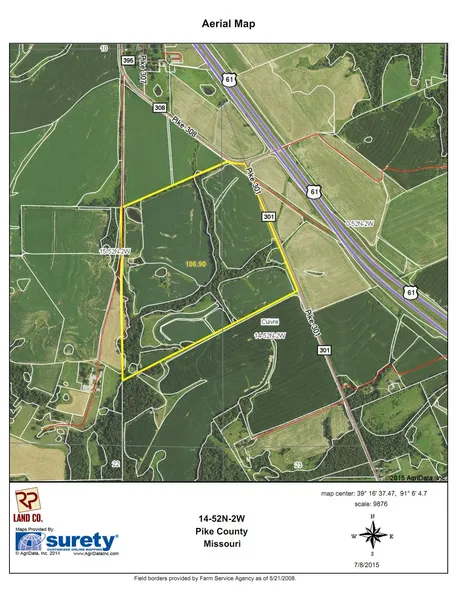 106.9 surveyed acres located south of Bowling Green in Pike Co. 77 acres tillable cash rented for $225 in 2015. Balance in wooded draws. Just off Hwy 61. Asking $4750/acre.