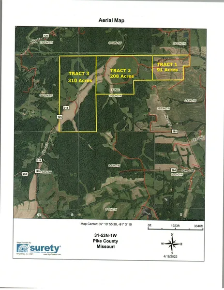 Directions: From south side of Bowling Green, MO take Hwy. 61 south 4 miles to Hwy. F, turn left and cross the north bound lane of Hwy. 61, continue east for 3/4 mile to Pike County Road 263, turn right and go east 2 miles to Pike County Road 218, turn left, go 3/4 mile to the Smith Property which is on both sides of the road. OR From Troy, MO take Hwy. 61 north 25 miles to Pike County Road 218 (by St. Charles Hardwood in Cyrene, MO), turn right, go east 2.5 miles to the Smith Property, OR From Louisiana, MO take Hwy. D south 7 miles to Pike County Road 262, turn right, go 1 mile west to a private driveway (just past the water tower) that leads off to the left, continue on south 1/4 mile to the Smith Property on both sides of the road.