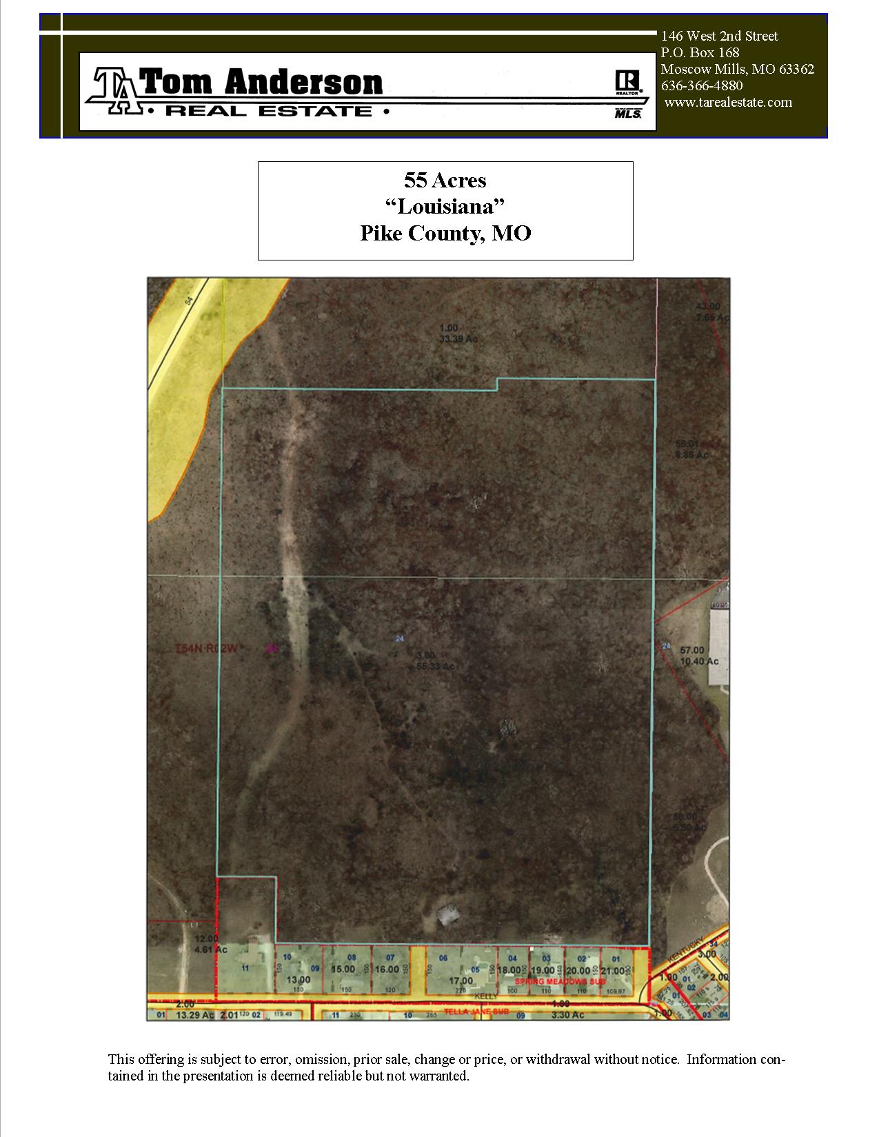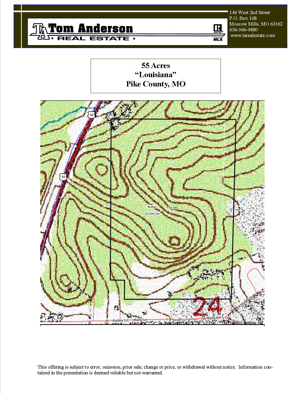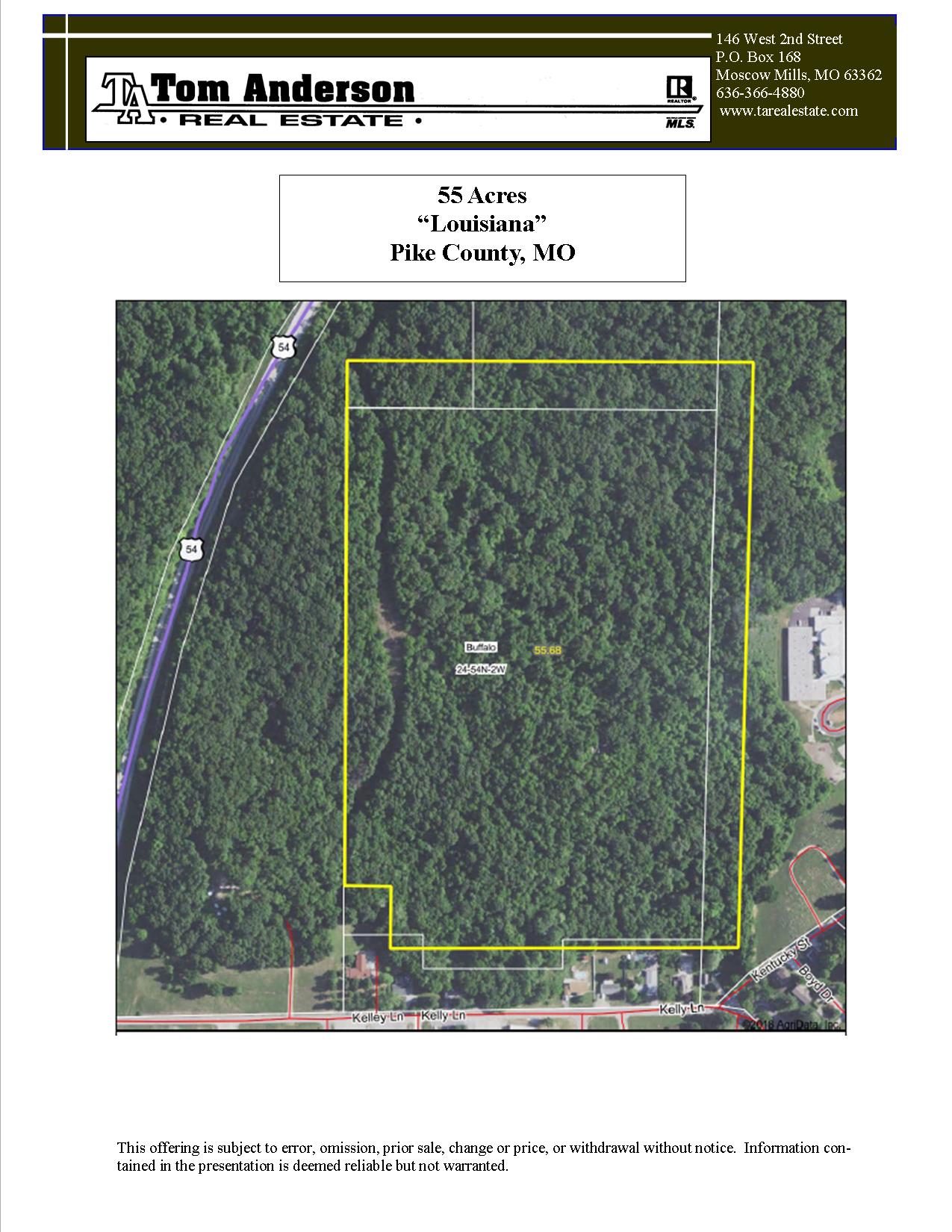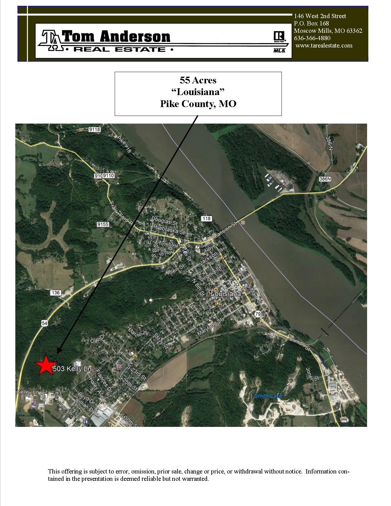 Located in historic Louisiana Missouri lies this 55-acre tract. This all wooded property sits high on a ridge top overlooking the Mississippi River Valley boasting panoramic views and vistas of the countryside. This property is ideal for personal residence, development, and/or recreation in the City Limits of Louisiana with public sewer & water.