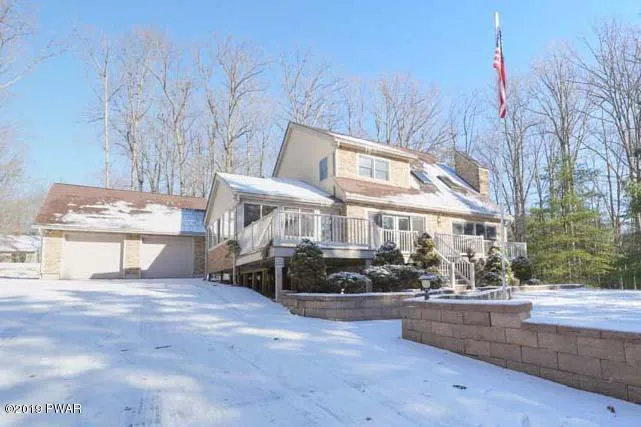 Tanglwood Lakes Contemporary! This Lake Wallenpaupack lakerights home offers 4 bedrooms, 2.5 baths, wide open floor plan, HW floors, living room with fireplace, main level bedroom, bright & airy sunroom, full finished lower level room with family room AND an awesome bar room! Detached 2 car garage w/ room above, private setting, yet only a short walk to the access of Tanglwood Lake!
