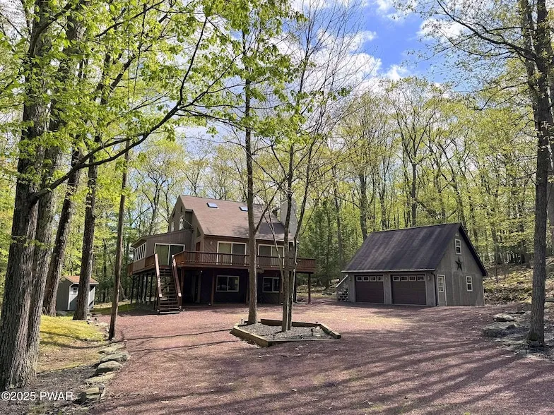 Well-Kept Contemporary Chalet - Your Private Spa Retreat in Tanglwood Lakes (Comes Furnished!)Beautifully maintained and thoughtfully designed, this 4-bedroom, 3-bath contemporary chalet is serenely situated in the highly sought-after Tanglwood Lakes community. Whether you're looking for a peaceful full-time residence or the ultimate vacation escape, this home offers a seamless blend of modern comfort, natural beauty, and resort-style amenities. Just a short golf cart ride from the fairways of the 18-hole PGA Fazio-designed golf course or the community's private access to Lake Wallenpaupack, you'll enjoy the perfect mix of recreation and relaxation. Step inside to discover an open floor plan highlighted by soaring cathedral ceilings and a dramatic two-story stone fireplace--the stunning focal point of the living room. Oversized windows frame views of the surrounding woods, creating a tranquil, light-filled atmosphere throughout. A heated Florida room and airy open loft offer flexible spaces to unwind or entertain. The modern kitchen features granite countertops, updated appliances, and custom touches designed for both style and functionality. New energy-efficient ductless A/C units and ceiling fans provide comfort in warmer months, while a propane fireplace and cozy wood-burning stove keep the home warm all winter long. The finished lower level expands your living space with a spacious family room--perfect for movie nights or game day gatherings. Outside, two expansive decks extend your living space even further. One includes a built-in hot tub, ideal for stargazing or soaking after a long day. The front sun deck is especially impressive with its generous size, ideal for multiple seating areas, games, or simply soaking up the sun. A detached two-car garage adds further versatility, featuring a large upper level ready to be transformed into a game room, art studio, or private office. Don't miss this rare opportunity to own a move-in ready sanctuary!