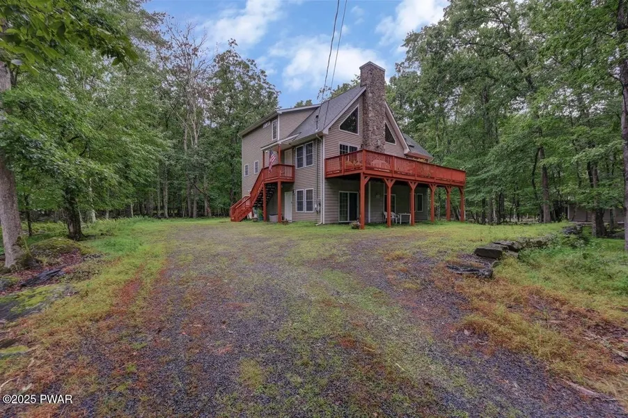 Masthope Chalet with a great location offering an easy short walk to Westcolang Lake, extended driveway creating a private setting, rear of property adjoins a greenbelt. Home is being sold mostly furnished featuring 3-4 BD, 3.5 BA, open floor plan, main floor primary suite w/ jacuzzi tub and WIC, 2 fireplaces, expansive front deck, hardwood floors, expansive kitchen with granite and ss appliances, CAC and heat, 2 car garage, storage throughout, bonus flex room in lower level. Masthope amenities include skiing, lodge w/ Summitt restaurant, scramble, tiki bar, 2 outdoor pools, minigolf, ATV trails, fitness center, horseback riding, Delaware River access/park, multiple sports courts, motor boating lake w/ beach and more.