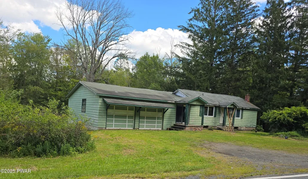 Set on just over half an acre, this single-level home features 2 bedrooms, an attached two-car garage, and a traditional layout with a spacious living area. The kitchen features warm wooden countertops, and a back porch overlooks the yard with stairs leading down to the open backyard for easy outdoor access. The basement provides additional space that can be used for storage, a workshop, or hobbies. Located close to Lake Wallenpaupack, Promised Land State Park, and main roadways, the property offers a peaceful setting with quick access to recreation and nearby amenities.