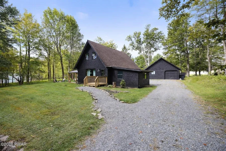 Welcome to The Hazelton Cabin -- your quintessential Pocono getaway with all the charm you'd expect, plus thoughtful modern touches. Nestled in Greentown's Tranquility Falls community, this beautifully renovated 3-bed, 2-bath cabin blends cozy rustic vibes with comfortable livability. Step inside to an open-concept layout where reclaimed barnwood and warm finishes welcome you into a relaxed living/dining space -- perfect for gathering after a day of exploring. The well-appointed kitchen makes meal prep effortless, while versatile living spaces (including a den that doubles as a home office or bonus guest room) keep everyone comfortable. Three generous-sized bedrooms and two full bathrooms create an easy, inviting flow throughout the home. One bedroom and a full bath are conveniently located on the main level, while two additional bedrooms and a second full bath are upstairs offering a nice balance of accessibility and privacy. The layout feels warm and intentional, ideal for hosting guests, weekend escapes, or settling in and enjoying the relaxed cabin atmosphere. Outside, the property continues to impress! A covered patio with gazebo offers a comfortable space for relaxing, outside dining, or entertaining, while the detached garage includes a workshop area, loft storage, and a finished bonus room--ideal for a game room, creative studio, or extra hangout space. A whole-house generator adds peace of mind, and a small, fenced area is perfect for gardening or giving pets a secure place to roam. The community inground pool, playground, tennis courts and clubhouse are just a few steps away! All of this, just minutes from Lake Wallenpaupack, local dining, and year-round recreation, makes this a truly well-rounded retreat!