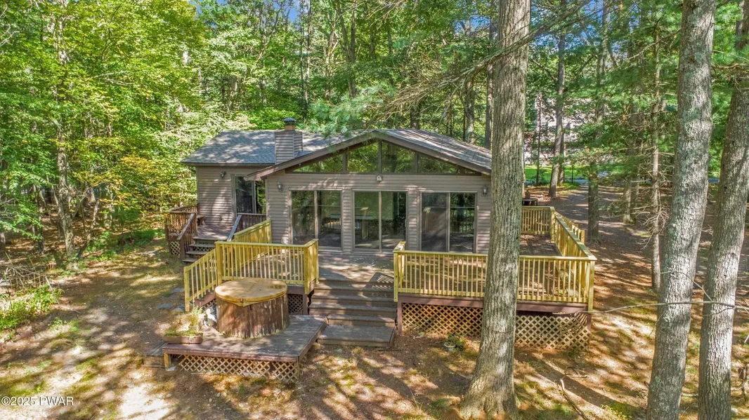 On a wooded acre with 200 feet of direct lake frontage, this 3-bedroom, 2-bath ranch with attached garage is set in a peaceful mountain community. The home features a kitchen with granite countertops, island bar, hardwood floors and modern appliances. The living room boasts vaulted ceilings and a brick fireplace, while the dining area opens to a lakeside deck with a hot tub. The primary bedroom includes a walk-in closet and private bath, complemented by two additional bedrooms and a full bath. A dedicated laundry area adds convenience. A gentle path leads to the shoreline, where a large dock and screened gazebo sit along the water, creating an ideal spot to enjoy the lakefront setting.