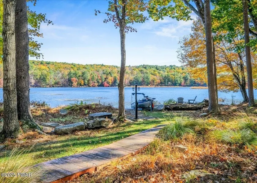 Welcome to 320 Tinkwig Drive, a beautifully maintained lakefront ranch offering four bedrooms and three baths in a peaceful wooded setting. This property blends comfort and style with direct lake access and serene water views throughout. The main level features an open-concept design with vaulted ceilings, abundant natural light, and a striking floor-to-ceiling stone fireplace as the centerpiece of the living area. The kitchen includes generous cabinetry, stainless steel appliances, a center island with seating, and an adjoining dining area that opens to a spacious rear deck overlooking the lake. The private primary suite offers an ensuite bath and direct access to a charming sunroom, a warm and inviting space to relax and take in the wooded and lake views. The fully finished walkout lower level provides a large family room with built-in shelving, a kegerator, full-sized refrigerator, and direct access to the covered patio and backyard. Additional upgrades include an on-demand water heater, soothing hot tub, and a whole house generator for peace of mind. The gently sloped lot leads to your own private lakefront with a small launch area, perfect for kayaking, fishing, or simply enjoying the tranquil setting. Located just minutes from Lake Wallenpaupack, this home is ideal as a full-time residence, vacation getaway, or investment property. Short-term rentals are permitted--schedule your private tour today!
