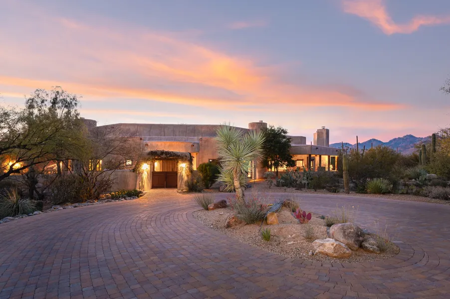 Live in complete privacy & seclusion w/ mountain views on an 8.43-acre gated residence situated on the gentle mountain slopes at the intersection of the Catalina & Rincon mountains in the lush Tanque Verde Valley, the green jewel of the desert that is traversed by 2 notable seasonal creeks. Horses are allowed at this sanctuary-style estate designed by famed architect Myron Goldfinger. Located minutes from the famed Tanque Verde Guest Ranch, this area is steeped in rich history & is designed for sparse population providing starry nights, dreamy sunrises & sunsets, mesquite bosques & abundant desert wildlife. Renowned builder Ray Birch delivers meticulous craftsmanship carefully executed in the distinct Santa Fe style characterized by double adobe construction, imperial plaster, custom Butler windows and doors, exposed natural wood viga beams, saguaro ribs, honed flagstone floors and multi...