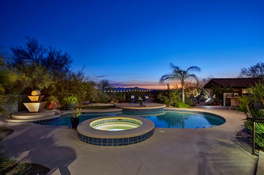 Location, Location, Location! Situated on a dramatic view lot in the heart of the Foothills, is this tastefully updated 4 bedroom contemporary home designed for entertaining with a great floorplan & resort like backyard to experience & enjoy the sought after Tucson Lifestyle. As you enter, your eyes are drawn to the spacious living room featuring a gas fireplace, soaring ceilings, large picture windows framing the Catalina's and ample wall space for a large art collection. The gourmet kitchen features granite countertops, stainless appliances and opens into the family room, a breakfast nook and leads to the formal dining room w/a built in buffet & wine fridge. Downstairs also offers a guest suite w/bath, Rogo's concrete floors, LED lighting, a powder rm, large laundry rm w/utility sink & an oversized 3 car garage w/workshop & storage. Upstairs you will find the luxurious master suite w/hardwood floors, spa like bathroom w/walk in shower, soaking tub overlooking the city lights, custom closets and a view balcony overlooking the sparkling pool & spa and the most spectacular sunsets in the world! In addition, you will also find two large bedrooms upstairs along with a full bath and roof deck. The backyard is an entertainer's dream featuring an outdoor kitchen w/pizza oven, bbq grill, sink & fridge, Ramada w/flatscreen tv, fireplace, Bocce Ball court, artificial turf lawn, and a newer built in Jacuzzi overlooking the twinkling city lights.