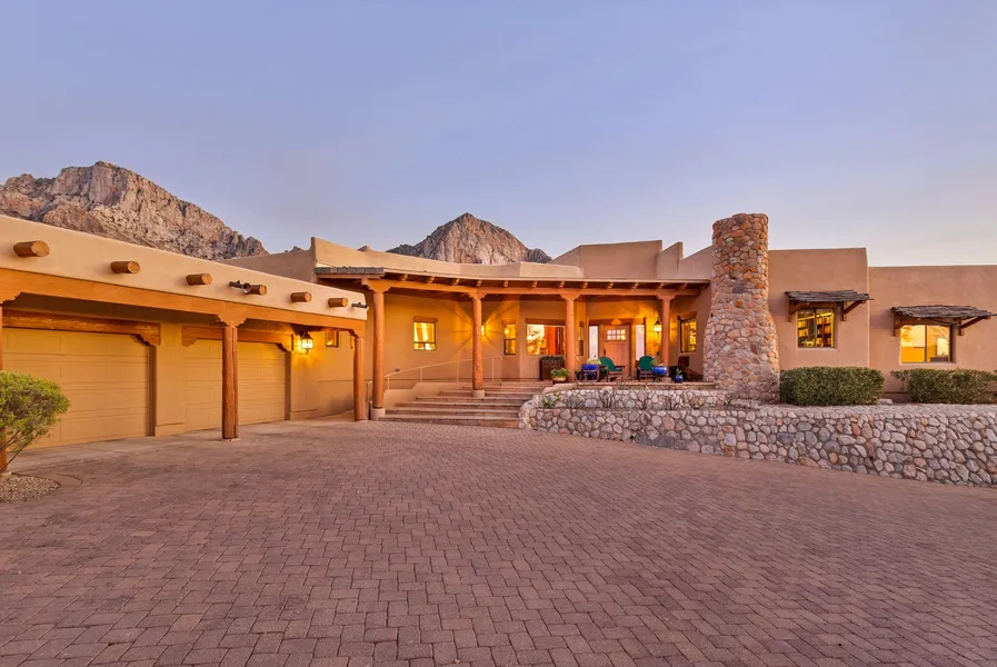 Immerse yourself into the true surroundings of the Old Pueblo with this stunning Santa Fe Style estate. Located in the guard gated La Reserve Community at the base of the Catalina Mountains and Pusch Ridge, this home will not disappoint. It backs to protected National Forestry land so you have truly unobstructed, jaw dropping city and/or mountain views from every corner. Offering 4,251 s/f of living space this home's floor plan moves nicely and has a warmth throughout with its charm and character, beautiful beams and desert backdrop. From the moment you step into the large foyer, you are captured by the most amazing views offered in Oro Valley. The family room off the kitchen provides plenty of space for furniture placement, beehive fireplace and step down breakfast nook. Separate living area can be used for additional tv room, game room, library, you name it. The large kitchen provides high end appliances, walk in pantry, island with gas cooktop, warming drawer, desk area and plenty of cabinet and counter space. Just off the kitchen is a breezeway with backyard access and a dumbwaiter to the lower garage spaces. This home features a split bedroom plan with the 4th bedroom currently used as a den with the second of three beehive fireplaces located here. The other two generous size guest bedrooms have a Jack and Jill bath in between them. The owner's suite is truly a retreat with more beams, the third beehive fireplace, separate sitting area, wrap around closet, walk in shower, jacuzzi tub and two access doors to the back and side yards. The outdoor spaces will certainly not disappoint! On the north end you have the Catalina Mountains as the backdrop for the pool & spa, multiple sitting areas, BBQ, and pool bath complete with shower. On the south end you have a park like setting with wonderful desert landscaping and a sitting area to enjoy those Arizona sunsets and Oro Valley city views. There are 3 garage bays. The smaller 3rd bay is separate from the main 2 and is heated and cooled and features a half bath. Be sure to watch the showcase video! Don't miss out on the peace and serenity this home offers.