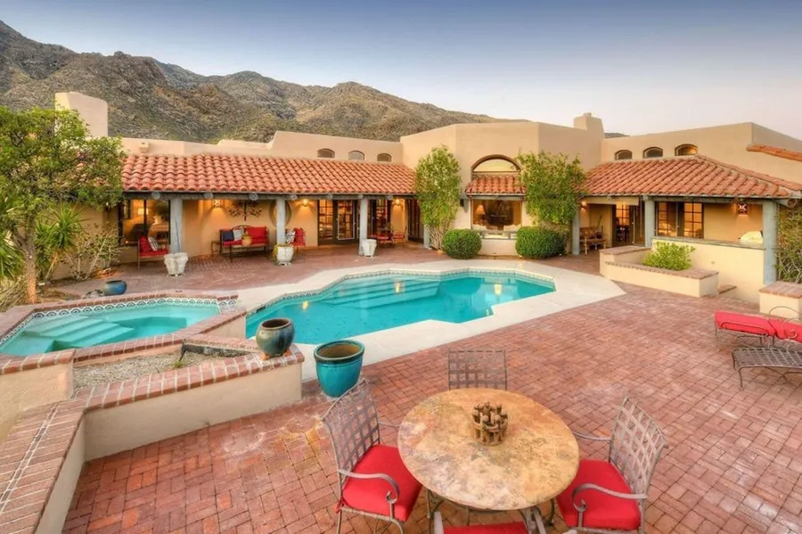 A rare opportunity to find city & mtn views in prestigious manned gated Finisterra Estates. Front courtyd w/antique hand carved wooden front entry doors, 4,292sqft, exquisite living rm w/lg picture windows,14ft high beam ceilings,dramatic fireplace,formal dining rm, light & open kitchen, beautiful talavera tile countertops, stainless steel appliances,6 burner gas range,Sub-Zero,butler's pantry,brkfst rm,cozy fam rm off kitchen,brick flrs,beam ceilings & French doors thruout, lg rec rm/library,3 bedrms+study w/built-ins or 4 bedrms & 4 baths incl master w/sitting area, fireplc, lux bath w/marble & designer tile,garden tub,lg shower,closet w/wood flrs. Enjoy resort-like bkyd w/covd brick patio,gas heated pool,spa,lush landscaping,fruit trees,city views,comm pool,spa,tennis & Dist16 schools.