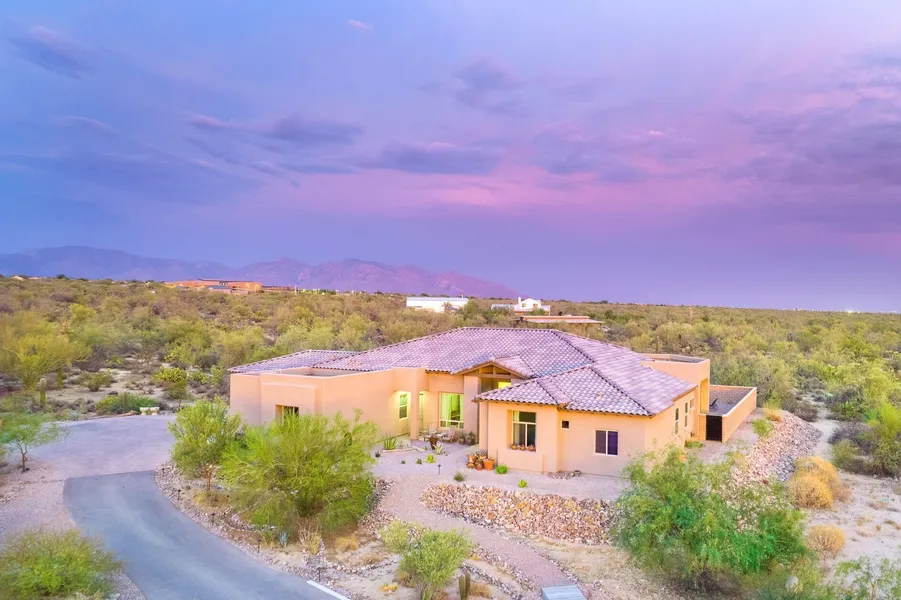 Live the epitome of the Arizona lifestyle in this stunning AF Sterling contemporary dream home, set on a 2.59 acre lot in coveted Garden Estates, a premier gated community of only 25 homes adjacent to Dove Mountain, featuring large lots and custom homes. This 4 bed plus den, 3.5 bath main home, built in 2019, is a perfectly executed blend of stylish designer finishes, functional living spaces, and a tranquil setting among the towering saguaro cacti and lush desert landscape. The attached 1 bed/1 bath Casita w/ separate entrance, dual 2 car garages, and panoramic views make this an exceptional opportunity not to be missed. Wood plank ceramic floor tile, designer paint colors, and 12' ceilings enhance the open floor plan, perfect for casual family gatherings or elegant entertaining. The Chef's kitchen is a dream come true with extra-large quartz island, cabinets galore, double ovens, gas range, gorgeous glass tile back splash, and enormous walk-in pantry - perfect for your biggest Costco run! The Master Suite is complete with a spa-like master bathroom with modern soaking tub, walk in shower, double vanities, and features a large picture window. Two additional bedrooms share a full bath, while a third bedroom has its own private bathroom and large closet. The attached Guest Casita features a living room, generously sized bedroom, and full bathroom - your guests may never leave! In the backyard, enjoy the Pebble-tech pool with lagoon shelves at both ends, covered patio, and plenty of room for all your backyard activities. Experience the spectacular Arizona sunsets and cool desert evening temps year-round. For the golf enthusiast, the Gallery Golf Club and the Golf Club at Dove Mountain, a Ritz Carlton Resort featuring a stunning 27 hole Jack Nicklaus designed golf course, are both only a short 5 minute drive. This beautiful home with luxurious nearby amenities offers a lifestyle unmatched in Tucson yet is only 1hr from Sky Harbor Airport.