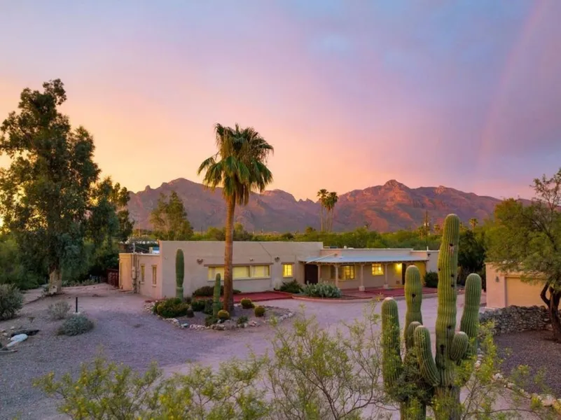 Private1.9-acre estate located in sought-after Casas Adobes. Enjoy the best of both worlds, living alongside nature on this sanctuary-style property and walking to Whole Foods, Starbucks, Orange Theory & more in just minutes from this prime location. Charming main house built in 1952, 1183 sf detached guest house w/ private backyard, 3-car garage w/ 2 large storage rooms, backyard w/ pool & spa and separate yard area w/ artificial turf. Live free of restrictions-NO HOA here! Enter through custom iron gates on a long, circular driveway to the front of the house w/ a wraparound patio. This warm home is loaded w/ character w/ saguaro-ribbed & wood-beamed ceiling, wood floors, brick walls, glass French doors & a wood-burning fireplace. The spacious kitchen w/ white cabinets, SS appliances & tile counters is open to the family room. The breakfast bar & breakfast nook offer casual dining. The family room flows to covered patio & backyard w/ pool, spa & exceptional mountain views. Adjacent, separately fenced side yard w/ artificial turf perfect for kids or dogs. The main house has a split bedroom floor plan w/ a primary suite on one side & 2 additional bedrooms joined by a jack & jill bathroom on the other side plus an office/den. The detached 3- car garage has two large separate storage rooms & a door that leads to the guest house. Darling two bedroom guest house can be used as an Air BNB, for a family member, or for visiting guests. This incredible location has it all-walkability to fantastic restaurants, coffee, bars, shops, and more, easy access to world-class golf resorts & country clubs, and access to I-10, the University of Arizona, and downtown Tucson.
