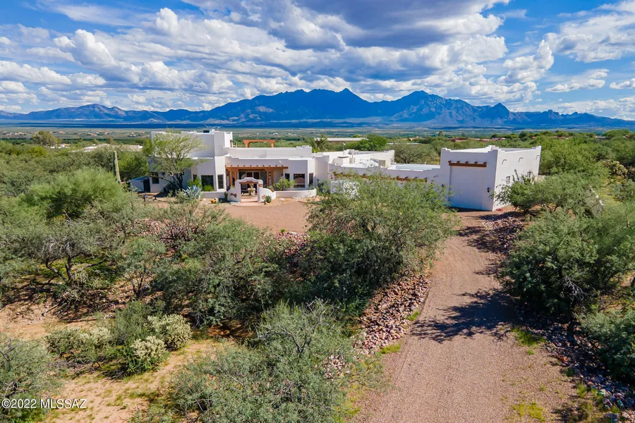 Luxurious Santa Fe home in the prestigious Foothills of Green Valley. Complete Comfort with every amenity, inside and out, wrapped in a Spectacular Setting on 3.3 acres of privacy, desert wildlife and Awesome Views. 15ft wood/beamed ceiling in the great room. Huge Gourmet Kitchen featuring Hickory cabinets, Sub Zero refrig and freezer, Dacor 6-burner gas cooktop in the 7ft granite island, prep sink, butler pantry, wet bar. Enormous Master Bedroom Suite with a 10x10 custom walk-in closet adjacent to the laundry room and elegant bath. Separate wing for the two guest ensuites. All rooms including a full bath open on an Amazing Resort-Style Patio, Saltwater Heated Pool, Spa, Outdoor Kitchen, Firepit. A spiral staircase leads to the 2nd floor Viewing Deck and interior theater/media room.