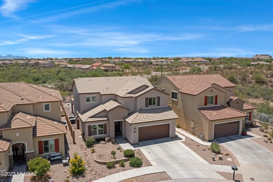 Nestled within the highly coveted Sierra Morado Neighborhood on Tucson's Southeast Side, this meticulously maintained residence presents an exceptional opportunity to acquire a contemporary gem built in 2013. With its prime location in the renowned Vail School District and a tranquil cul-de-sac setting, this home offers the perfect blend of modern comfort, functional design, and an abundance of community amenities. Upon entering, you are welcomed by a gracious foyer that leads into an expansive open concept living space, seamlessly combining the kitchen, dining area, and family room. High ceilings and large windows flood the interiors with natural light, creating an inviting and airy ambiance. The well-appointed kitchen boasts granite countertops, stainless steel appliances, ample