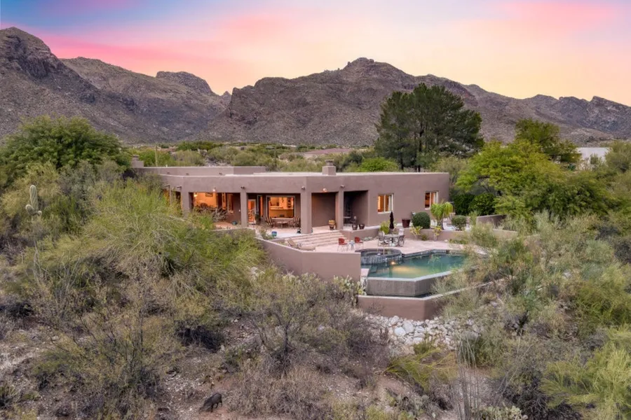 Welcome to your serene desert oasis nestled in the prestigious gated community of Pima Canyon. This luxurious 3713 sq ft, 5-bedroom, 4-bathroom residence sits on nearly 1.5 acres of meticulously landscaped desert terrain. Greeted by breathtaking vistas of the Catalina and Tucson Mountains, as well as captivating city lights, this property boasts panoramic views in this elegant setting. Designed for both privacy and functionality, the split-bedroom plan offers tranquility and space for all. The heart of the home, a spacious chef's kitchen, features top-of-the-line Viking stainless steel appliances, perfect for culinary enthusiasts and entertaining alike. Step outside to an entertainer's paradise - a negative edge pool and spa invite you to relax while soaking in the stunning surroundings.