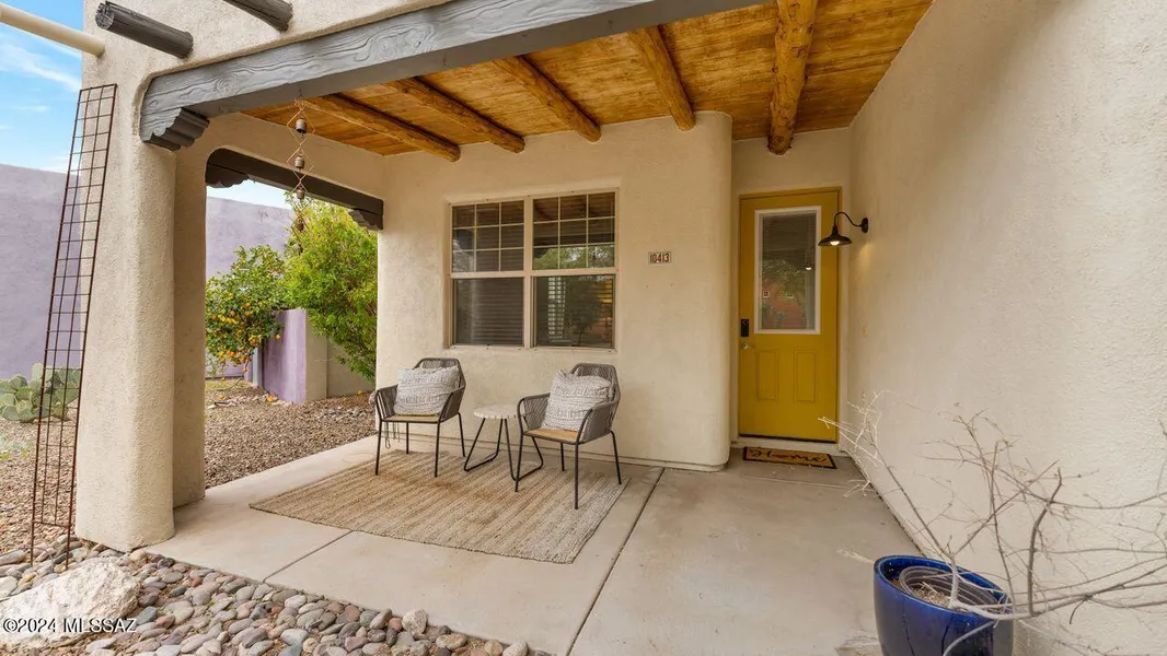 Stunning 3 bed / 2 bath Santa Fe style home in the beautiful Civano Community. As you step inside, you're greeted by a meticulously remodeled interior, with sleek concrete floors accentuated by lofty high ceilings adorned with rustic beams. The remodeled kitchen stands as the centerpiece, featuring a spacious island, pantry, and a generously sized dining area that flows into the backyard creating an inviting space for indoor-outdoor gatherings. Enjoy and relax in your elegant ensuite bedroom, with its spacious walk-in closet and luxurious ensuite bathroom. This home has a newer AC system, water heater, and updated appliances. The front door has been freshly painted and upgraded with new glass, and for added security and convenience, a Ring doorbell has been installed. The house's exterior