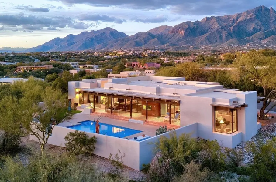 Stunning architect designed soft contemporary,1.3 ac. ridgetop homesite w/majestic city & mt. views in prestigious gated Catalina Foothills Est.#10. Exceptional home w/ long private driveway & sparkling entry fountain. exquisite living rm w/ dramatic floor to ceiling windows, 11ft. Douglas fir beam ceilings, fireplace, formal dining rm w/built-ins, wet bar, gourmet island kitchen w/quartz countertops, Miele SS appliances, dbl ovens, pantry, breakfast area, family rm w/fireplace, tile floors, 3 bedrooms study/exercise rm, 3 baths, primary bedroom w/sitting area, fireplace, lux. bath, large walk in closet, laundry rm & oversized 2 car garage w/storage rm. Enjoy gracious outdoor living w/ covered patio, gas heated 30'x14' lap pool, turf, lush landscaping, fab views & Dist. 16 schools.