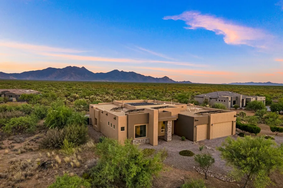Surrounded by pristine desert while in a neighborhood setting, 2661 E Old Stone House Trail offers residents a beautiful blend of nature and community. By design, the Stone House enclave creates privacy with 1-acre lots, along with intentional open areas that encourage a connection to the desert, birds, animals, and the mountains. This community borders thousands of acres of open space, which includes the Santa Rita Mountain Range & wildlife refuge. Sitting in a cul-de-sac on the eastern end of the neighborhood, the view corridor to the south from this property is expansive and beautiful. Set back from the road, the paver drive leads to an extended 3-car garage, appealing stone-clad exterior, and double door main entry.