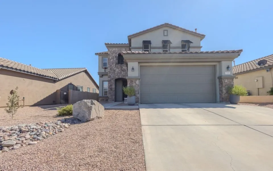 This stunning 5-bedroom, 2.5-bathroom home offers the perfect blend of comfort, style, and convenience. Spacious and Inviting with ample living space, a thoughtfully designed layout, boasting travertine tile and wood flooring throughout the main living areas, window casings and extra tall baseboards adding a touch of elegance. Your downstairs bedroom might provide a peaceful sanctuary or venturing into the backyard you'll surely enjoy the tranquil desert greenbelt, ensuring privacy with no rear neighbors. Nestled in the desirable Rancho Sahuarita community, offering easy access to schools, shopping, and recreational amenities, this home is a must-see for those seeking a spacious, modern, and family-friendly living experience. Don't miss out on this incredible opportunity! *New HVAC 2023