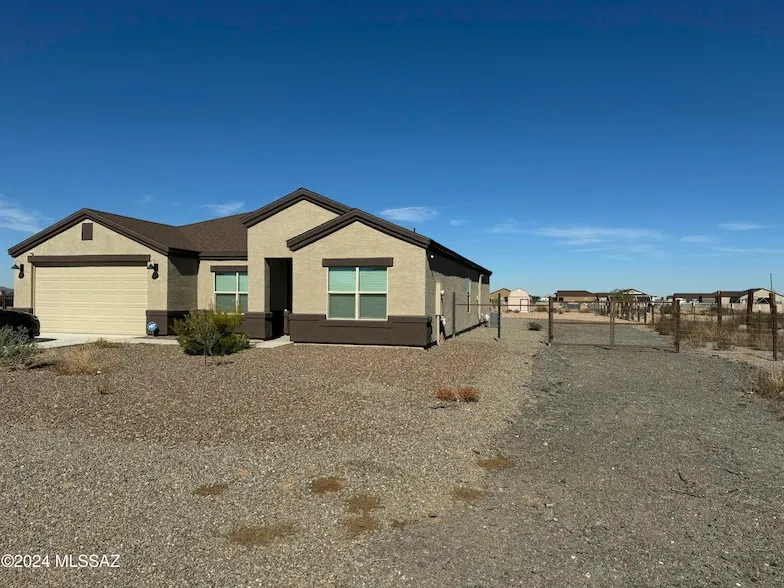 Rare opportunity to own a brand new home on an acre w/ NO HOA. This open concept floor plan has 9' ceilings & wood look ceramic tile throughout the home w/ carpeted bedrooms. The perfect options were chosen for this home including blinds for all windows, ceiling fan pre-wire at back covered patio, home theater pre-wire, 8' doors, a soft water loop, epoxy garage floors, in the garage. Kitchen includes a walk-in pantry, granite countertops, & a large island with a breakfast bar. Dine off of the kitchen in the dining nook or in the formal dining space. The primary bathroom has a separate soaking tub, walk in shower and two vanities. Now is your chance to grab the most popular floor plan in the Development. Backyard is fenced in and comes with 2 Tuff shed storage units.