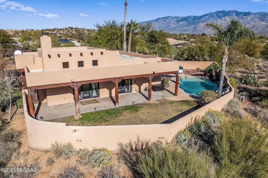 Stunning custom 4BD/3.5BA + office (2,607 sq ft) two-level (basement) Santa Fe set back on a 1+ acre hilltop lot affords breathtaking mountain and city light views! Masonry block construction, polished Saltillo/plush carpet, skylights, rough cut beams. Gorgeous living room has soaring ceiling, beehive fireplace, French doors off patio with southerly views. Chef's kitchen boasts granite & copper countertops, island, breakfast bar & dining area. Master Suite w/French doors hosts a jetted tub/shower, dual vanity w/quartz countertop, walk-in closet. Additional 2BD/1.5BA on main level. Lower level features a large family room, 1 Bedrooom + Office + 1 full BA. New HVAC 2024