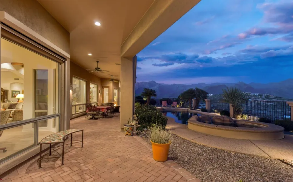 The architectural details elevate the home: arched entry with columns, gallery walls & lighted niches to display art. Tile floors throughout, no carpet. The formal dining room is adjacent to the great room, featuring soaring wood-beam ceilings, an impressive fireplace covered in Idaho quartzite, a wet bar, & a built-in entertainment center. A bright, open kitchen with a center island has a breakfast bar, two sinks, granite countertops, stainless steel appliances, a separate wine refrigerator, and a walk-in pantry with custom shelving. The breakfast nook is the perfect casual dining space to enjoy the sensational mountain views. The kitchen & great room flow effortlessly to the backyard with a covered patio that serves as an outdoor living & dining room for seamless indoor/outdoor living. The pebble-tec pool & spa and the low-care desert plantings complement this private setting. Enjoy the built-in BBQ at the outdoor kitchen while taking in the beautiful surroundings. Inside: exceptional owner's suite positioned to capture maximum views has a gas fireplace & a door to the patio. Large his & hers walk-in closets are outfitted with custom built-ins. The spacious owner's suite bathroom has a dual sink vanity, a separate make-up vanity, a jetted tub, & a separate shower. Hall bath with shower adjacent to guest bedroom one (currently used as an office) can also be a powder room for guests. Guest bedroom two is ensuite with tub/shower, tile surround & vanity, and granite countertops. The spacious second owner's suite is situated to display the incredible mountain views through floor-to-ceiling windows and has a door to the patio. The ensuite bathroom with a door to the backyard (for the pool) has a dual sink vanity, granite counters, and an oversized shower. The owners have diligently cared for this home since they built it in 2001. The roof was recoated & the parapets were sealed in 2025. The exterior of the house was painted in 2023. Recently replaced systems include two new 18 SEER Trane HVAC units, new upgraded irrigation system, new automatic patio & window solar screens, new dual pane skylights, new Starite pool heater, new Pentair screenlogic pool control system, new Pentair Intellipro variable speed pool pump, hunter douglas shades & wood blinds, whole house carbon filtration system & KCI water softening system, and new upgraded Milguard Ultra fiberglass windows in the dining room. See the amenities and features list for more details.