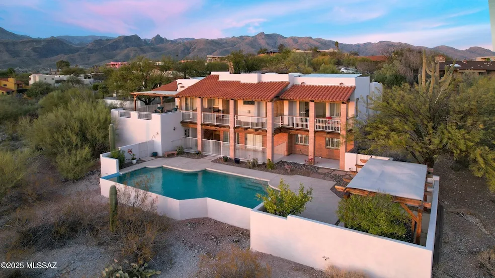 Panoramic City & Mountain views. Visit this 4088 sqft home at the end of a quiet cul-de-sac. 4 beds and 3.5 baths on two levels overlooking the beautiful backyard Pool. An entertainer's dream with multiple decks and covered patios. Main floor includes the Primary bedroom & ensuite bath, as well as the Living, Dining, Family rooms and Kitchen. The home features high wood ceilings, exposed beams, plantation shutters & windows & doors galore. The lower level includes 3 guest bedrooms, 2 full bathrooms and a Recreation room. The Rec room opens to a covered patio and the Pool. Enjoy nearby McDonald and Agua Caliente parks, golf courses, hiking & biking trails, Schools & shopping. Oversized 3-car garage. Leased Solar. Low HOA