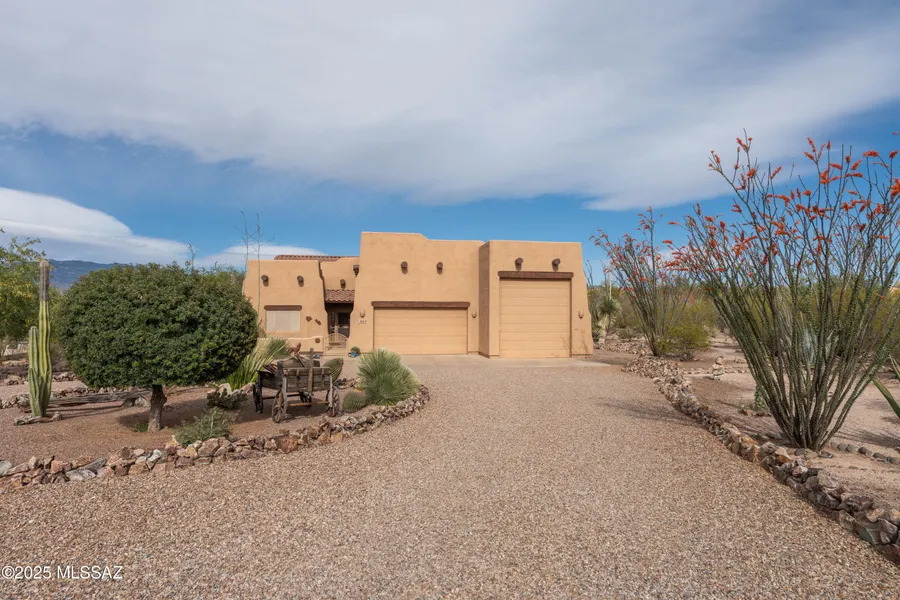 Tucked away in the highly desirable Antler Crest community, where homes are rarely available, 8963 S Placita Asta Vieja offers a breathtaking blend of comfort, style, and privacy. Nestled on 1 acre in a quiet cul-de-sac, this desert sanctuary delivers tranquility and convenience. Experience gorgeous panoramic mountain views with nearby trail access for outdoor enthusiasts. This gem features high ceilings, expansive windows, and an open, airy feel. The great room invites you to relax by the cozy fireplace, while the tile floors keep the space cool and stylish.The chef's kitchen is a showstopper, showcasing custom cabinetry, sleek Silestone countertops, stainless steel appliances, and breathtaking views from the dining area window.The split-bedroom design ensures privacy, with the