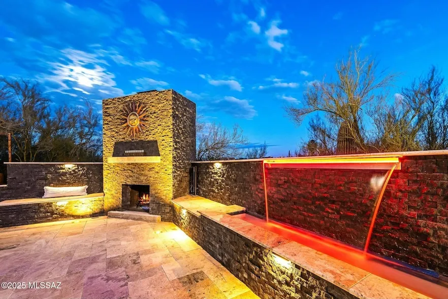 Rare find with nicely fenced 1-acre+ w/NO HOA! See matterport & video to experience the impressive updated 4/2 ranch home w/resort style backyard desert, owner is a pro Designer! Lap pool, jacuzzi, stunning fireplace w/lit up sitting area, travertine pavers, multiple waterfalls, rain curtain outdoor shower and breath-taking views of mountains/sunset/sunrises. Spilt & open floor plan w/impeccable attention to detail. Custom tile/recessed lighting thought-out, kitchen boost SS appliances, walk-in pantry, skylight, backsplash, 4X7 island opening to dining/living w/smart TV & LED fireplace. Primary bath has skylight, 8ft dual vanity, 40x60 shower w/premium glass barn door, modern toilet w/heated seat, bidet, automatic cover/seat lift/LED lit rim. Solar paid, Whole home H20 filtration system.