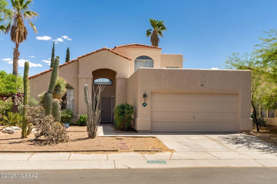Step into this stunning 3-bedroom, 2-bathroom home, where a grand entryway and cathedral ceilings set the stage for refined living. Spanning 2,252 sq. ft., the welcoming foyer opens o an expansive living room and formal dining area, creating the perfect space for gatherings. The spacious kitchen, adorned with granite countertops and stainless steel appliances, extends effortlessly to a breakfast bar, complemented by a coy breakfast nook, generous pantry, and adjacent family room featuring a wood-burning fireplace, with gas plumbing available for added convenience. Designed for comfort, the split floor plan places two bedrooms and a full bath downstairs, while the owner's suite and loft await upstairs. The loft includes a built in desk, ideal for work or study. The owner's suite boasts a private balcony with breathtaking views of the Catalina and Tucson Mountains, overlooking the sparkling pool and spa. The main bath offers duel sinks, a soaking tub, separate shower, and a spacious walk-in closet. The backyard retreat invites relaxation with a cozy patio, a refreshing pool, a relaxing spa, and two fruit trees for a touch of nature.