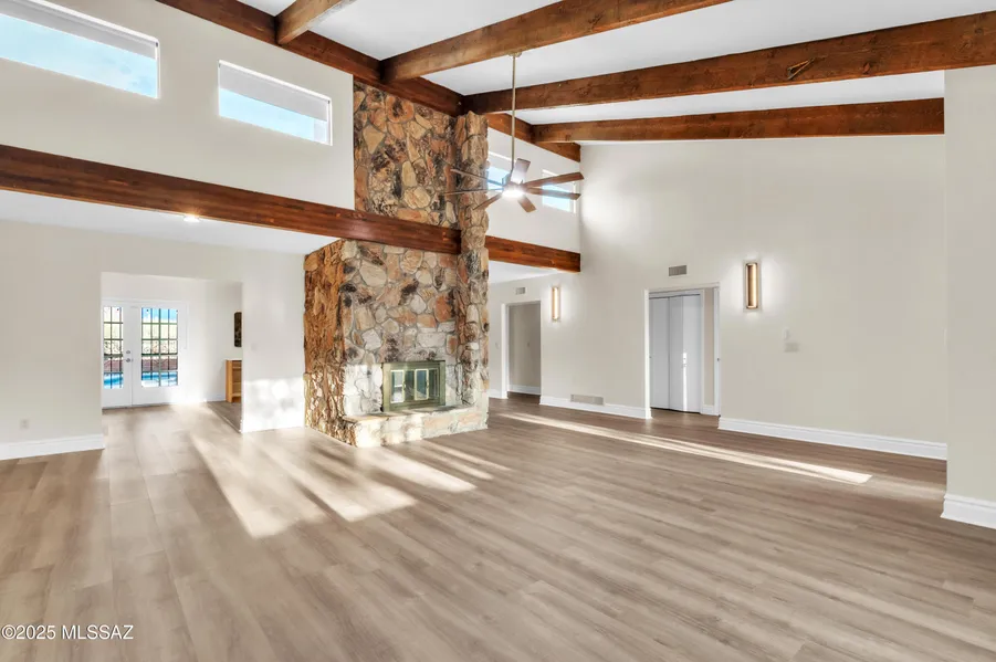 Elegant Desert Retreat with Panoramic Mountain Views and Endless Charm. Welcome to your own private sanctuary--nestled in the sought-after Catalina Madre subdivision, this beautifully remodeled home offers the perfect blend of elegance, comfort, and space. Set on a flat, usable acre+ of horse property surrounded by mature desertvegetation and majestic saguaros, you'll enjoy sweeping views of both the Catalina and Rincon Mountains from nearly every angle. Inside, a thoughtfully designed open floor plan awaits, featuring soaring vaulted ceilings, an oversized living room and familyroom, and a dramatic floor-to-ceiling fieldstone fireplace that is double-sided for added ambiance.