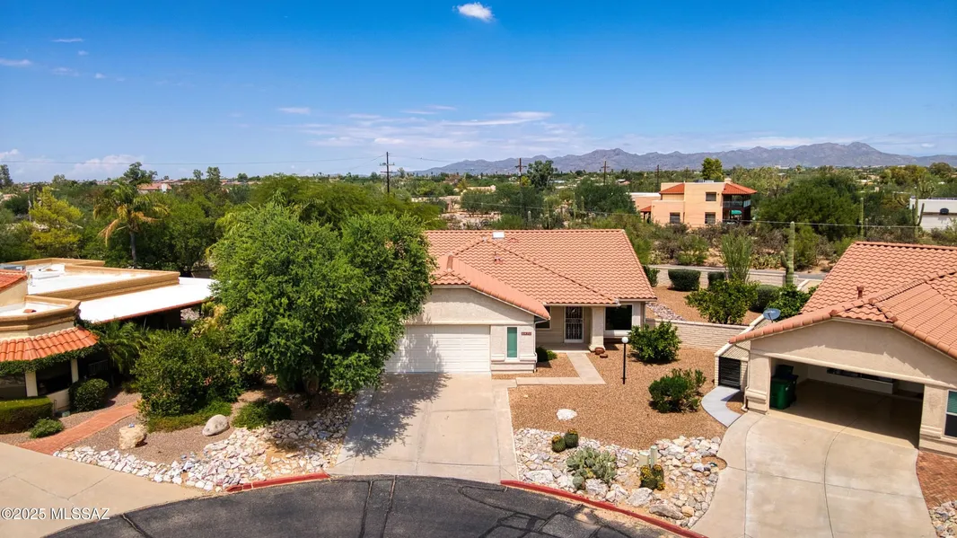 Tucked in a quiet cul-de-sac within the gated community of Alta Mira Village, this 4-bedroom, 2-bath, 1,769 sq. ft. home blends comfort and Southwest appeal. Highlights include vaulted ceilings, cozy fireplace, upgraded Anderson windows and slider, and a kitchen with solid-surface countertop and island. Spacious primary bedroom features walk-in closet and soaking tub. One of the bedrooms offers flexibility as an office or den. The private backyard features a covered patio, mature fruit trees, mountain view, and low-care desert landscaping. The 2-car garage with workshop space will help you stay organized and creative. Convenient Northwest location near La Cholla & Overton with shopping, dining, and recreation close by.