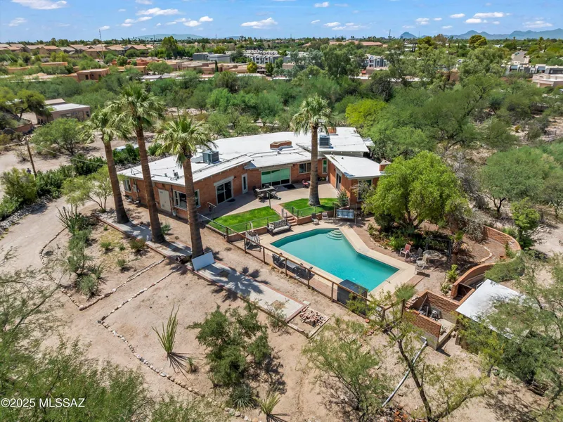 Welcome to this Mid-Century Adobe Retreat with Sweeping Mountain Views, offered with a flexible list price range of $985,000 to $1,100,000. A true one-of-a-kind Tucson treasure that showcases 100-year-old salvaged wood and soaring beam ceilings, blending historic character with desert beauty. Nestled on over three acres within city limits, the property features a shared well, septic, mature desert vegetation an abundance of wildlife. Surround yourself by 180-degree Catalina Mountain views from your backyard oasis, complete with a sparkling swimming pool. The fully equipped, attached private suite, is ideal for family guests, a private home office, multi-generational living or rental income. For the hobbyist or entrepreneur, a temperature-controlled attached workshop that provides plenty of storage space and is an ideal area to craft, build or run home-based business. Zoning will allow for a 3-way lot split. This is a rare chance to own a home that offers privacy, history, and is a one of a kind breathtaking property. Minutes from shopping, dining, top-rated schools, and scenic parks, this home puts everything you need within easy reach.