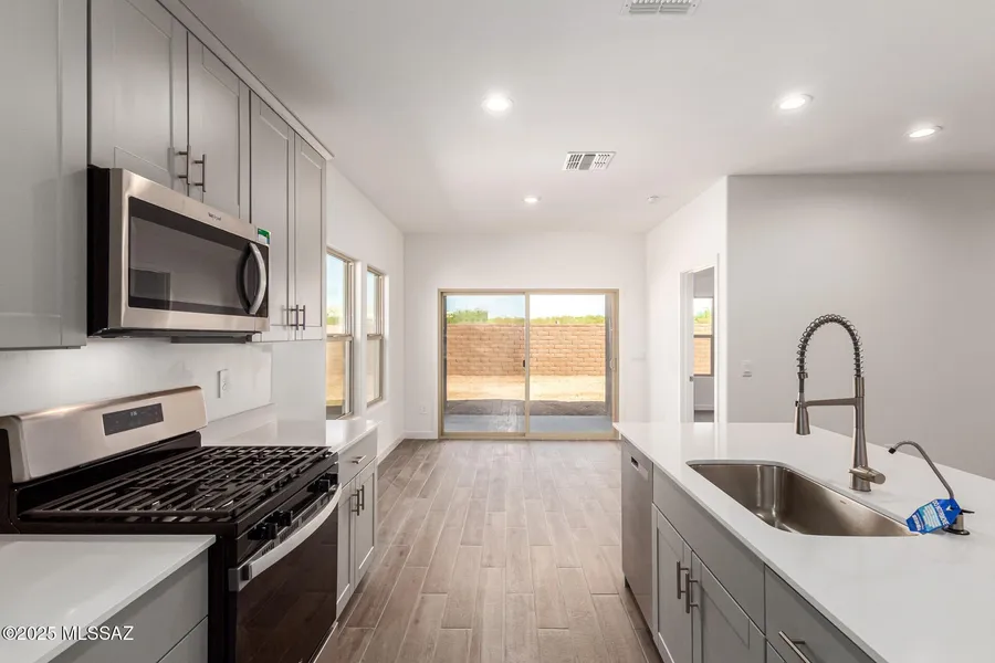 One of the last remaining homes in Casas del Cerrito, the most affordable new homes in the East Tucson area. This fully loaded, turnkey home is READY NOW, and has everything. ALL Appliances, Blinds, AND back yard gravel! You can't go wrong in this prime location, situated right across the street from the community park, with unobstructed views of the Catalina Mountains! Come check out the Baxter, a beautifully designed 1,423 sq. ft. single-story new home that perfectly blends modern convenience with the serene beauty of the surrounding desert landscape. As you enter through the welcoming front porch, you're greeted by a thoughtfully planned entryway that leads into the heart of the home - a spacious and open-concept great room. This central living area flows seamlessly into the dining space, creating an ideal environment for both entertaining and everyday family life. The gourmet kitchen, situated adjacent to the dining room, features elegant quartz countertops, a large island with a breakfast bar, modern appliances, and a walk-in pantry, providing ample storage and a perfect space for culinary creativity. The master suite, located at the rear of the home for added privacy, offers a generous walk-in closet and a luxurious en-suite bathroom with dual vanities and a walk-in shower. Large windows allow plenty of natural light to fill the space, creating a tranquil retreat. Two additional bedrooms are positioned near the front of the home, each with easy access to a full bathroom. These rooms are perfect for family members, guests, or a home office, offering flexibility to suit your lifestyle. For added convenience, the home includes a utility room and a two-car garage, with extra storage nook, ensuring that daily routines are efficient and organized. Step outside to the covered patio, where you can relax and enjoy the stunning mountain views and Tucson's beautiful weather year-round. Whether you're hosting a weekend barbecue or enjoying a quiet evening outdoors, this space extends your living area into the peaceful surroundings of Casas del Cerrito. Designed with energy efficiency in mind, The Baxter at Casas del Cerrito is a DOE Zero Energy Ready Home, ensuring long-term savings and a sustainable living environment.