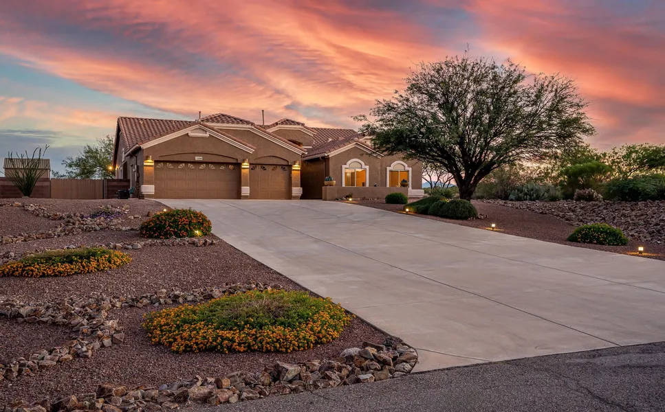 Split Floor Plan 5 Bedroom, 3 Full Bath, 3-Car Garage home on an elevated 1-Acre+ lot backing to a pristine desert preserve with incredible views! Assumable VA loan at 2.625% available for VA-eligible Buyers who meet terms. Elegant details include arched entries, diagonally-laid tile flooring and high ceilings. The kitchen features granite countertops, upgraded 42'' cabinets with sliding shelves, recessed lighting, stainless steel appliances, a large island, and a computer/work area with additional cabinetry. Separate formal Living and Dining areas plus a Family room with crown molding and French doors leading to the screened-in Arizona room provide multiple spaces for entertaining while enjoying the views. The spacious primary suite