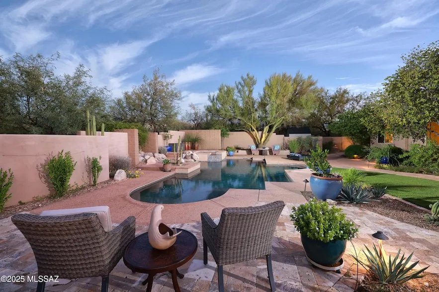 This beautifully updated home features breathtaking mountain views on 3.2 Acres with a 4 car garage & Rock waterfall and elevated heated spa that flows beautifully into the heated pool. A gated front courtyard with a soothing fountain welcomes you and sets the tone for what you're about to experience. Step through the custom mesquite entry door into a light-filled living space with walls of windows that frame the surrounding scenery. The gourmet kitchen, completely remodeled in 2023, showcases shaker-style cabinetry with lots of drawers. All Stainless steel appliances with Bosch refrigerator and top of the line WOLF gas cooktop with griddle, WOLF convection oven, WOLF steam oven. - a dream for any home chef. With 4 bedrooms plus an office, plus a den/TV room and 4 full baths... there's plenty of space for everyone. The luxurious primary suite offers a private sitting area, a two-sided fireplace, spa-like bath, and a large walk-in closet. Step outside to your resort-style backyard featuring a sparkling pool with rock waterfall, heated spa, outdoor fireplace, and artificial turf for easy care. The built-in outdoor kitchen with BBQ and seating is perfect for entertaining under the stars. Additional highlights include a tankless water heater (2021), two newer HVAC systems (2019), and a high-efficiency water softener. All this just half a mile from the trailhead, where you can enjoy hiking and the beauty of nature right outside your door.