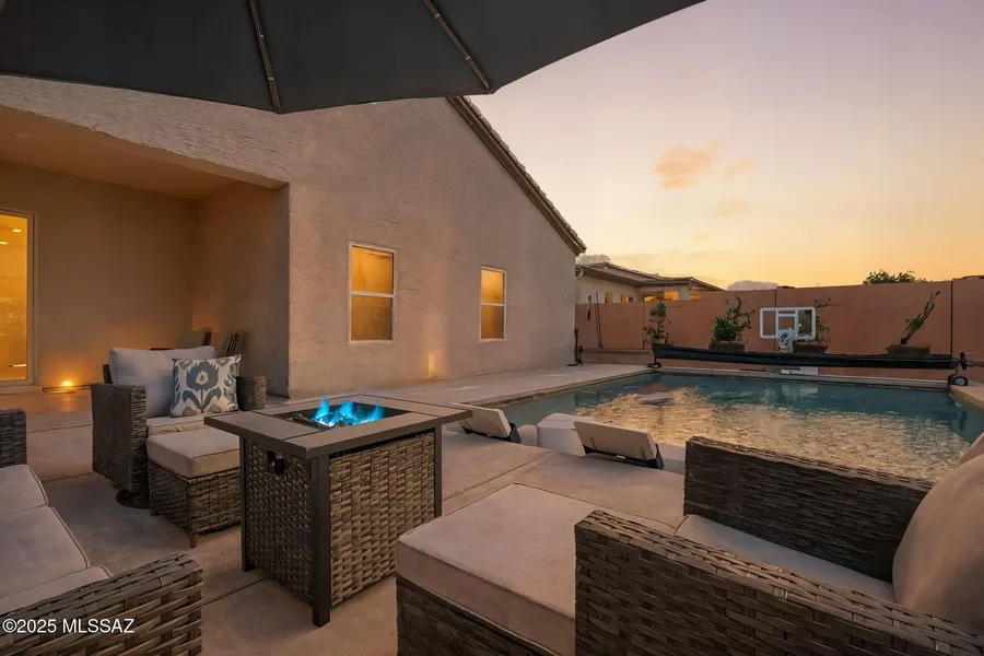 EXCEPTIONAL VALUE - PAID SOLAR PLUS HEATED POOL! Premium 2020 smart home in Vail School District with 4 bedrooms, 3 full baths, flex den/office, and 2577 sq ft of luxury living. ENERGY EFFICIENT: Owned solar panels, no lease payment save $ annually on electricity, EV charger installed, tankless water heater, RO water system. RESORT LIVING: Heated pebble tec pool perfect for year-round enjoyment on large lot with mountain views. UPGRADED KITCHEN: Huge granite island seats 6, gas cooktop, wall oven, premium Whirlpool stainless appliances, white cabinets, tile plank floors. SMART HOME READY: Golf simulator prewired with projector screens, TV prewiring all rooms plus patio, alarm system. GARAGE: Oversized 2 car with epoxy floors, 8ft high door, 4ft extension. Soaring 10ft ceilings. Turn key!