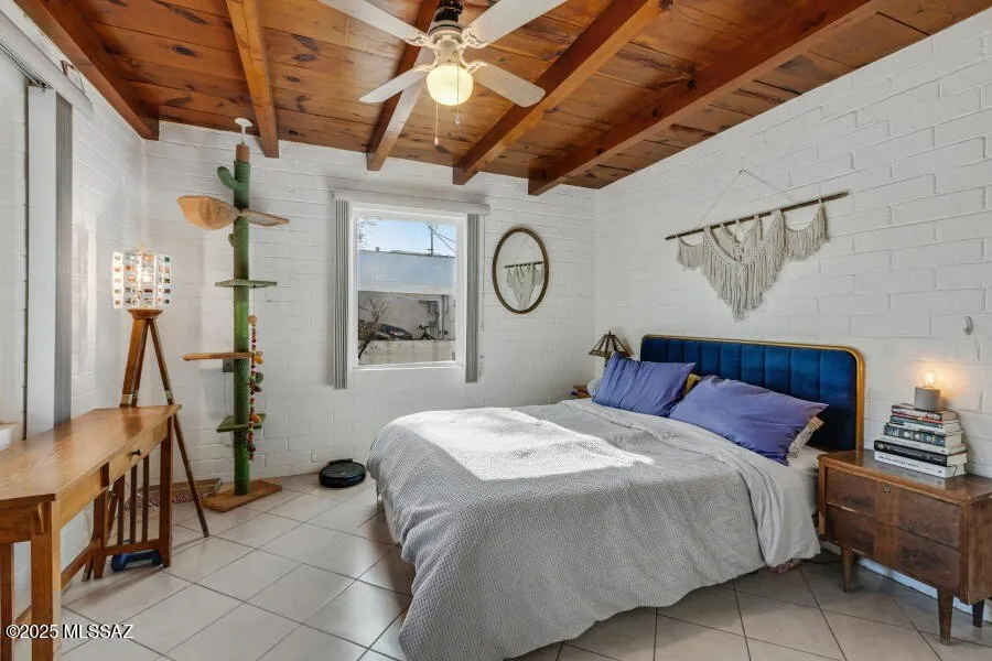 This centrally located home features two bedrooms, one bath, and a one-car garage, all situated on a spacious R-2 lot. Recent upgrades in 2021 include a new roof, modernized kitchen and bathroom, and new flooring throughout. Enjoy the charm of wood beam ceilings in both the living room and bedrooms. Additional benefits include double-pane windows for energy efficiency, xeriscaped front and backyard for low maintenance, and a storage shed. Conveniently located just 8 minutes from the University of Arizona and Banner Medical Center, and within minutes of Tucson Racquet Club and Rillito River Park.