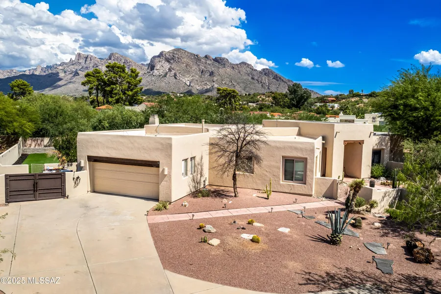 One of the largest lots in Logan's Crossing! This stunning single-level 4BD/3BA home offers nearly 3,000 sq ft on over 2 acres with mountain views and 14 ft ceilings. A gated courtyard opens to a split floorplan and chef's kitchen featuring professional-grade appliances, perfect for cooking or entertaining. Recent upgrades include 300+ sq ft of turf, extended pool deck with pavers, widened driveway, and a newly updated fireplace. Outdoors, enjoy a sparkling pool, outdoor kitchen with built-in BBQ, kiva fireplace, mature cactus garden, and side yard ideal for a golf chipping green. Picture windows fill the home with natural light, while the spacious master retreat captures gorgeous sunrise views. Oversized garage with storage and large laundry room provide everyday convenience. Large almost .5 Acre Fenced yard as well. Rarely do homes combine this level of privacy, upgrades, and lifestyle in one of Oro Valley's most desirable neighborhoods! Energy-efficient, solar adds long-term value.