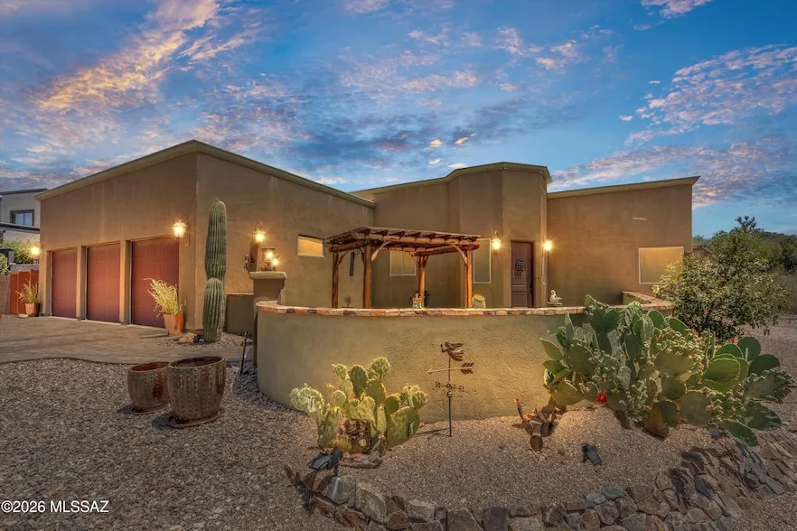An architecturally distinct Contemporary Santa Fe home designed, not duplicated. Foothills living done right. Set on an acre lot with no HOA in the Catalina Foothills, this newer, design-forward residence offers a compelling blend of architectural presence, thoughtful layout, and refined finishes. The home features four bedrooms and three bathrooms arranged in a well-executed split-bedroom floor plan, providing separation between living and sleeping spaces while maintaining an open, connected flow. Dramatic barrel-vault and tray ceilings, clean architectural lines, and expansive windows fill the interior with natural light and frame Arizona's ever-changing desert skies. At the center of the home, the chef's kitchen makes a statement with premium white cabinetry, exotic granite countertops with striking veining, stainless steel appliances, and a signature copper range hood framed by artis...