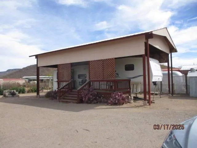 This corner lot is semi-private with a privacy fence blocking the neighbors and a row of Orleanders along the south lot line. The 5th wheel has 3 pull-outs and a large cover to protect the RV. Enjoy beautiful sunsets from the front covered porch.