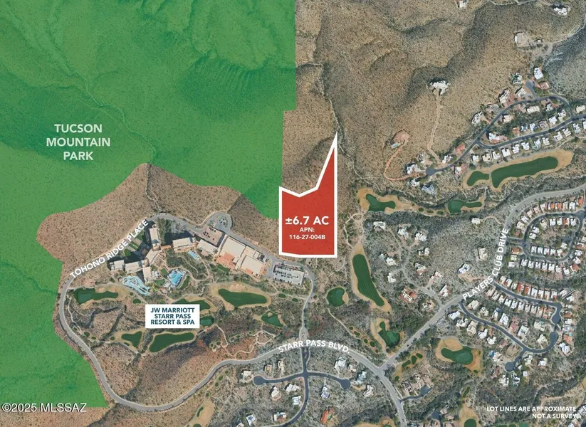 Perched high above the prestigious Starr Pass resort community, this rare 6.6-acre hilltop parcel offers one of Tucson's most spectacular custom home settings. Once part of a historic mining claim, the property captures sweeping 360-degree views of the Tucson Mountains, sparkling city lights, the distant Catalina peaks, and the green fairways of the JW Marriott Starr Pass Golf Course. Located just outside the formal Starr Pass subdivision, this homesite comes with a distinct advantage - no HOA, no dues, and no restrictive CC&Rs. That freedom opens the door to greater architectural creativity, whether you envision a bold contemporary retreat or a design that blends seamlessly with the surrounding desert. For those seeking even more space, the adjacent 6.6 acres are also available, creating a combined 13-acre opportunity. This is the highest homesite in the area, set directly across from the JW Marriott Resort & Spa. Towering saguaros and native desert flora create a pristine, natural backdrop, perfect for a signature luxury residence or the potential to split into multiple homesites. Optional resort memberships offer access to world-class golf, a luxury spa, fine dining, and fitness facilities. Bordering over 60,000 acres of protected parkland in Tucson Mountain Park and Saguaro National Park, the location is a paradise for hikers, bikers, and nature lovers. Despite its privacy, it's only minutes from Downtown Tucson, Mercado San Agustin, the University of Arizona, I-10, the airport, and major employers such as Caterpillar, Raytheon, and St. Mary's Hospital. Surrounded by high-end custom homes yet free from subdivision restrictions, this property delivers both exclusivity and flexibility a rare combination in one of Tucson's most sought-after resort areas. It's more than a homesite; it's a legacy property ready for a vision as exceptional as its views.