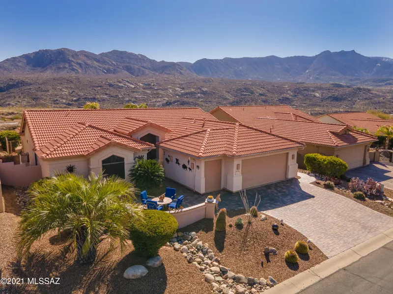 The first thing you see as you enter this beautiful Topaz is the fantastic view. Add to that the updated kitchen and baths, the meticulously maintained property and the resort style backyard, you have the formula for a perfect home in SaddleBrooke! Double sided fireplace between great room and patio. The kitchen update includes cabinetry, granite, cooktop and separate oven, relocated pantry and more. Bathroom updates include cabinetry, granite, walk-in shower in the owner's suite, vessel sink in guest bath and lighting. The backyard includes a solar heated pebbletech saltwater pool with spa and waterfall, semi built-in BBQ, full length patio, pavers in the side yard, and the view! The addition of the golf cart garage and pavers and the mature landscaping provides amazing curb appeal!