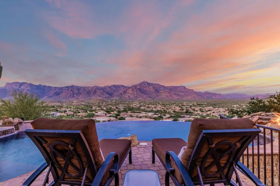Situated like an eagle's nest, this exclusive, gated mountain top estate provides unparalleled views of the Superstition Mountains. As you enter the front of this lovely home through the custom iron and glass doors into an elegant foyer, the beauty, craftsmanship and breathtaking attention to detail of this home become apparent. The large living room with it's limestone mantle on the fireplace, the beautiful coved ceilings is magnificent. Multi-panel sliding doors open to the view of the Superstition Mountains and provide indoor-outdoor living for a smooth flow when entertaining. At this point, you realize this is no ordinary home. The dining room has tall windows all around to take full advantage of the exquisite views. The designer kitchen has custom cabinets, a 6 burner Viking cooktop with a pot filler, magnificent stone backsplash, built-in fridge, 2 dishwashers, granite counters and a breakfast bar. The family room boasts a beautifully appointed wet bar with its own dishwasher and ice maker. Of course, no home of this caliber would be complete without its own wine cellar. Imagine waking to a perfect view of the Superstition Mountains.. This will be yours everyday in the serene beauty of the Primary suite. This suite has a sitting room, custom closet, a two-sided fireplace, and a truly luxurious bath. Each of the spacious bedrooms has its own beautiful bath. Outside, everything you could want has been incorporated. From the cozy fireplace and seating area to the built-in BBQ, the fire pit, and the pool and spa, every detail has been carefully constructed with you in mind. Once you view this magnificent home, you will be "Dead Sure" this is the perfect home for you!