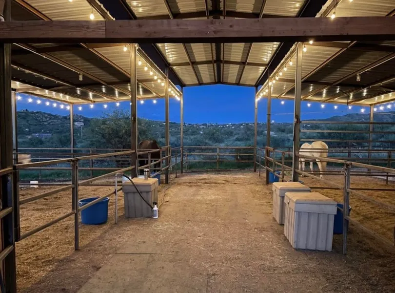 Access endless trails on State Land through your own private gate at this exceptional 3.34-acre equestrian property with glorious, unobstructed mountain views, and year-round cooler temperatures at 4,500 ft. elevation. The owners have painstakingly transformed this property into a discerning horse owner's dream with new, extensive horse facilities. The meticulously designed 2019 lodge-style home embraces the 360-degree Arizona mountain outdoors with tall ceilings, 8-ft doors, picture windows, and a sophisticated-rustic style. Natural stone countertops and custom cabinets throughout with traditional Amish-type craftsmanship provide high-quality and timeless finishes. The great room is open to the kitchen with a center island and breakfast bar. Concrete floors in the bedrooms and common areas, and the porcelain tiled bathrooms with spacious roll-in showers are stunning. Natural light pours in through large picture windows that frame the captivating mountain views. This split-bedroom floor plan has two oversized bedrooms and a versatile bonus room that could be used as an office, additional bedroom, exercise room, or whatever you may need. The exterior is naturally and professionally landscaped with indigenous trees and a large courtyard with lush grass, a wood-burning outdoor fireplace, an outdoor shower, paver patios, and low-maintenance raised flower beds. Designed to facilitate the effortless indoor/outdoor Arizona lifestyle with 1252 sf of wraparound covered patio space for taking in the views and entertaining. The round, cedar hot tub is situated to capture magnificent views in every direction during the day and skies abundant with stars at night. Two complete LQ/camper hook-ups and a new 6-stall center aisle barn, tack room, ample hay storage, and large pipe-fenced paddocks. The property can comfortably accommodate your family, horses, and visitors. The property is fully fenced and gated, offering seasonal grazing on native grasses. This homesite is ideal for enjoying star-gazing sunrises and the area's famed sunsets. The round, cedar hot tub is situated to capture glorious views in every direction during the day and skies abundant with stars at night. It is in immaculate condition and ready to enjoy a rural lifestyle, yet just a couple of miles to shopping, restaurants, and services, within an hour of Tucson International Airport and 85 miles to the Mesa Gateway Airport. The nearby Oro Valley Marketplace has everything from a movie theatre to a dentist and everything in between.
