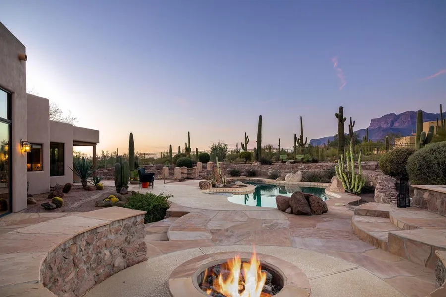 Elevated in Gold Canyon, sprawling custom 3,609 sqft home on 1.25 acres with a 3.5 car garage, huge pool and tons of VIEWS is nestled in-between Dinosaur and the Superstition Mountains to also take in city light views after the amazing Sunset views! This home is very cozy tucked at the end of the road with a huge paver turn around driveway. The inside and out layout is comfortable for living & entertaining small to large groups with the large and small living rooms, dinning areas, fireplaces, kitchen with 8 propane burner, dual ovens, massive kitchen island, wet bar with stool sitting, all looking out at the amazing backyard and Superstition views. The backyard has lots of custom features including the large local rock waterfall system with a pond, huge swimming pool, and VIEWS!!